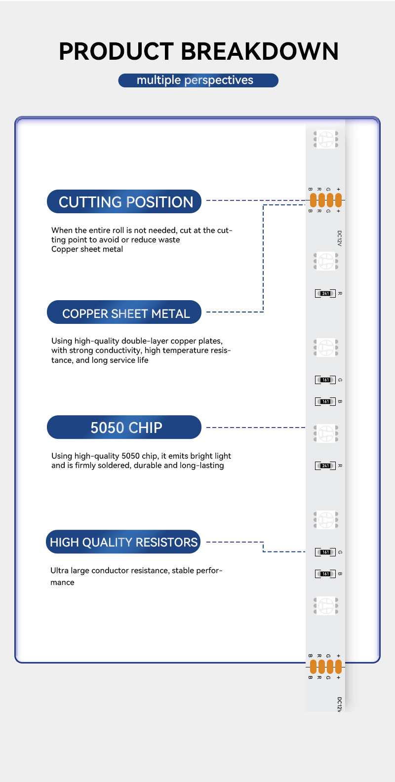 Consiga líneas perfectamente suaves y continuas de color vibrante con nuestro profesional Tira de LED RGB 5050 Diseñada para aplicaciones donde la consistencia visual impecable es fundamental, esta tira proporciona una cinta de luz uniforme que elimina las manchas y los gradientes, estableciendo un nuevo estándar de calidad en iluminación arquitectónica y comercial.