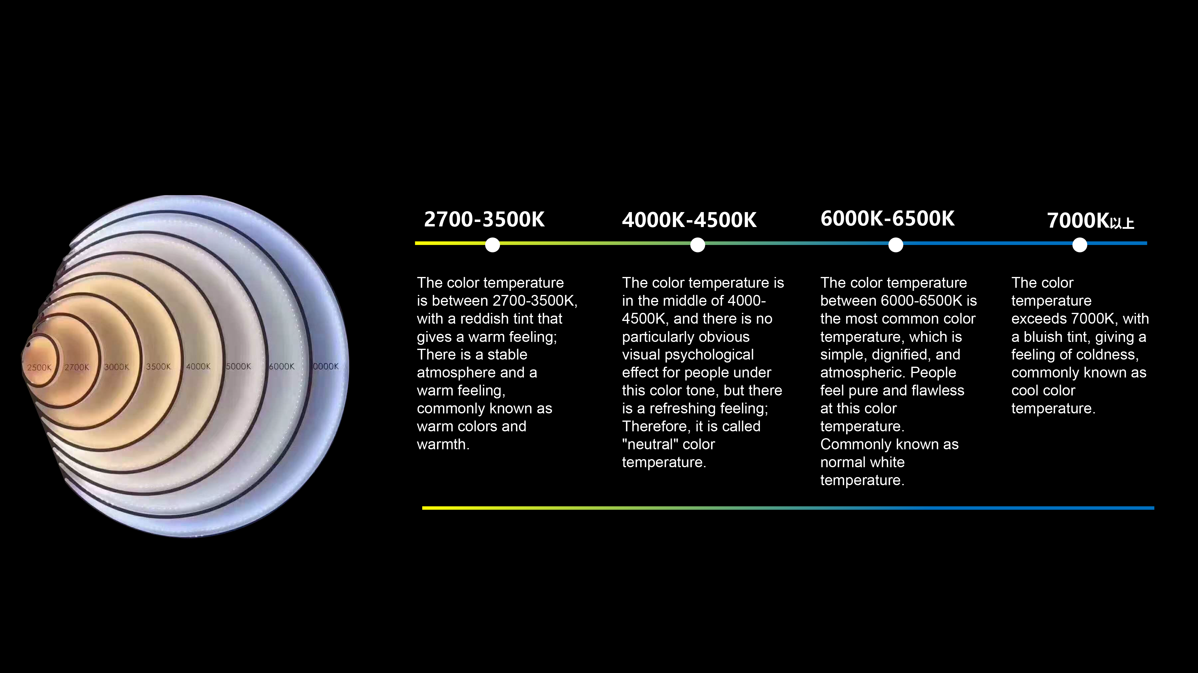Color temperature is measured in Kelvin (K) . It describes how the light appears: