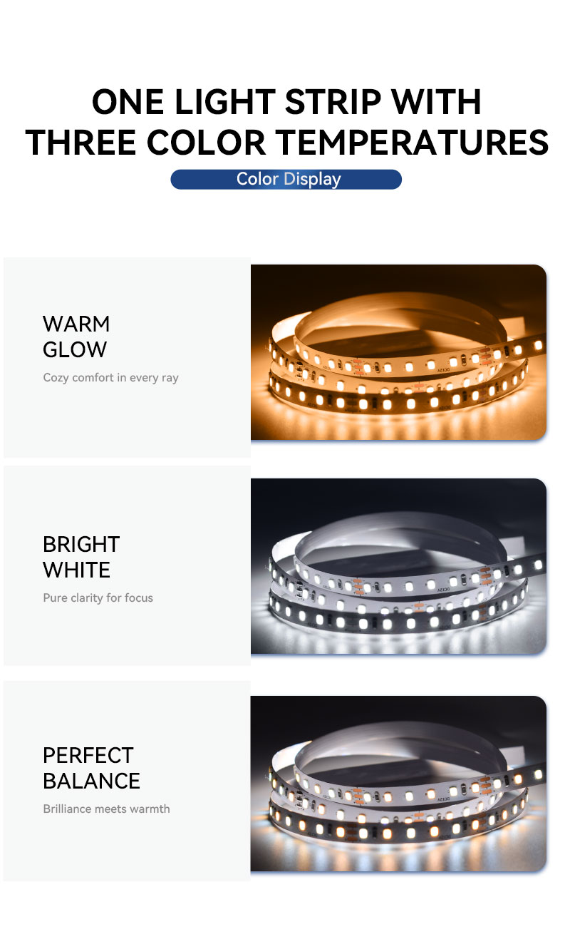 Este diseño de temperatura de color dual, alto brillo, alta densidad y anti-perlas muertas tira de luz LED Es una solución de iluminación potente, flexible y fiable. No solo proporciona suficiente luz, sino que también ajusta el color de la luz según las necesidades y su excelente durabilidad la convierte en la opción ideal para el diseño de iluminación moderno.